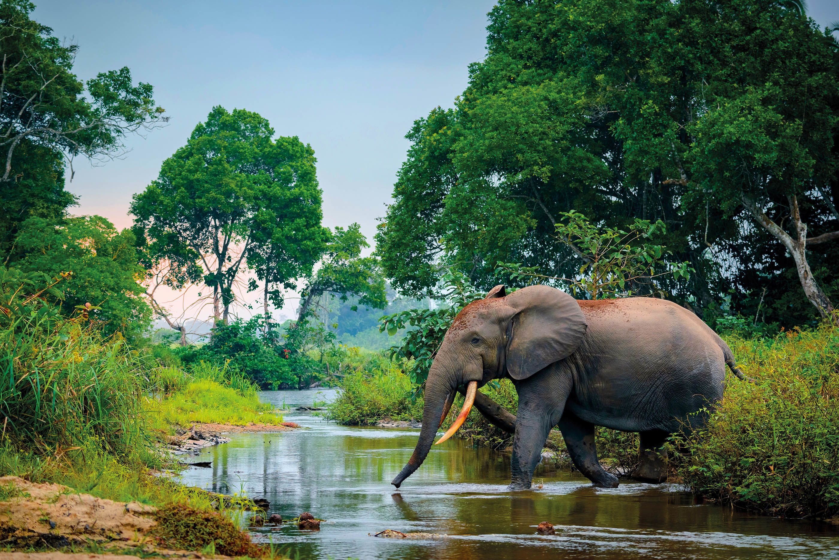 Bais are sometimes found in isolation, but often link together to create an expansive mosaic of open wetland – a magnet for wildlife. Herds of forest buffalo and elephant, all kinds of antelope and even primates emerge from the surrounding jungle to revel in these sun-soaked spaces and their nutrient-rich waters, while flocks of grey parrots and green pigeons provide noisy fly-bys. If there is truly an Eden on Earth, then surely this is it.